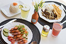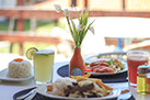 Delicioso Café da manhã e Restaurante com serviço a la carte, com cardápio variado de produtos, como carne, frango, peixe, saladas, lanches, sopas, massas, etc.